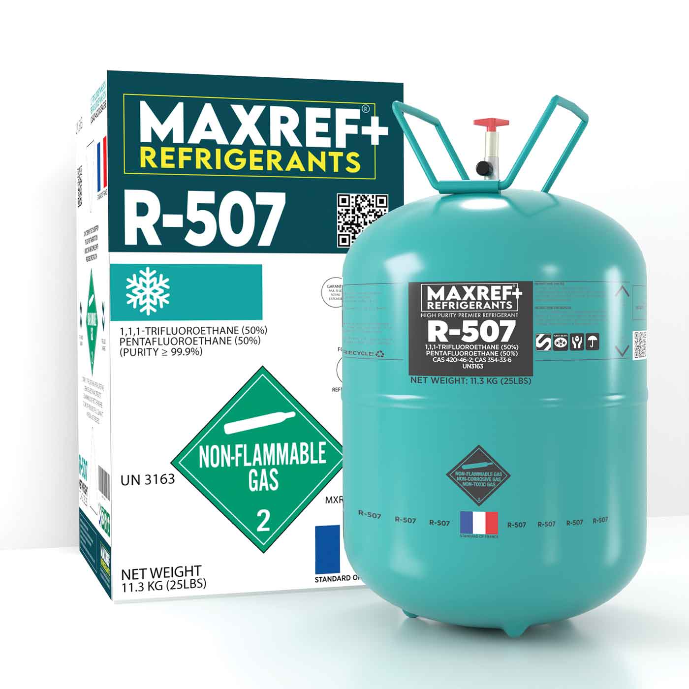 Classified as a colorless, non-flammable (A1 safety class) refrigerant, R507C is available under trusted brands including Euro, Maxref, Iceron, and Kalton. While effective, it has a high global warming potential (~3,300 GWP), making it a target for future phase-down under environmental regulations.